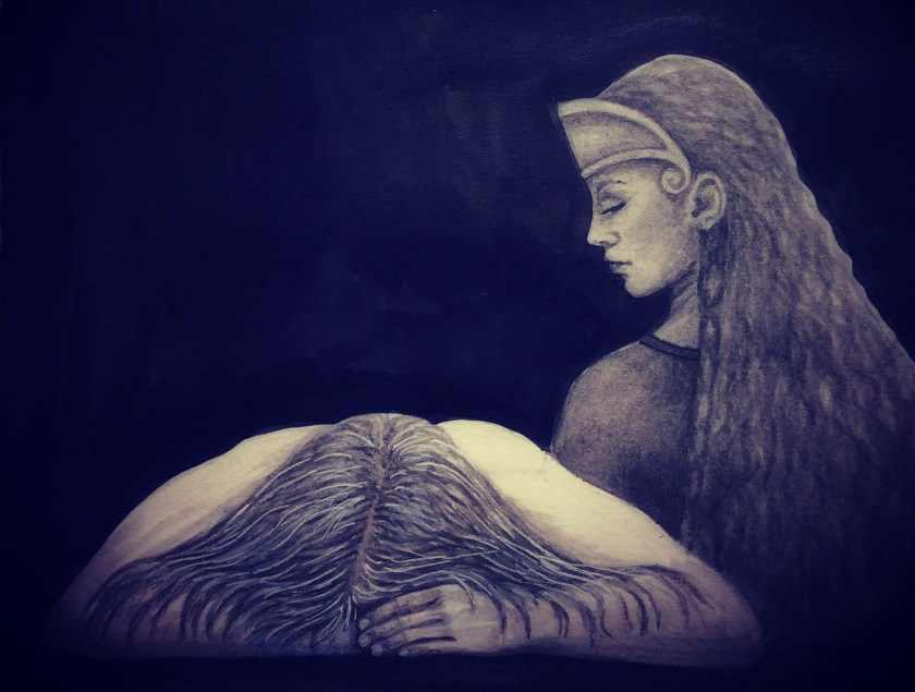 One of the lessons I have taken from the pieces I have made here is that I need to allow them to be a little rougher and freer, not seek to produce something that looks too ‘finished’ to my eye, lest I lose some of the raw emotion the initial drawings have. Pen and wash is a more stark and immediate media so good for expressing feeling and I need to remember to treat it with respect.