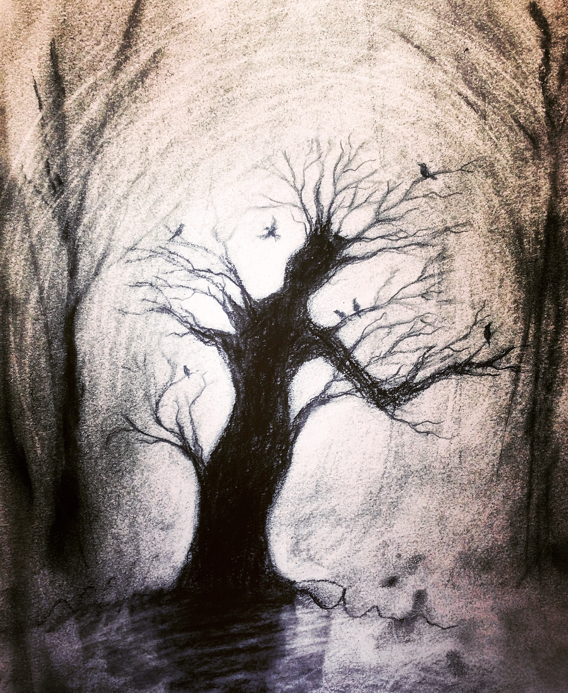 The girl stopped as she rounded the pinnacle, to catch her breath and glance at the ash with fear in her eye. Then she walked towards the tree and stood in the mossy shade.